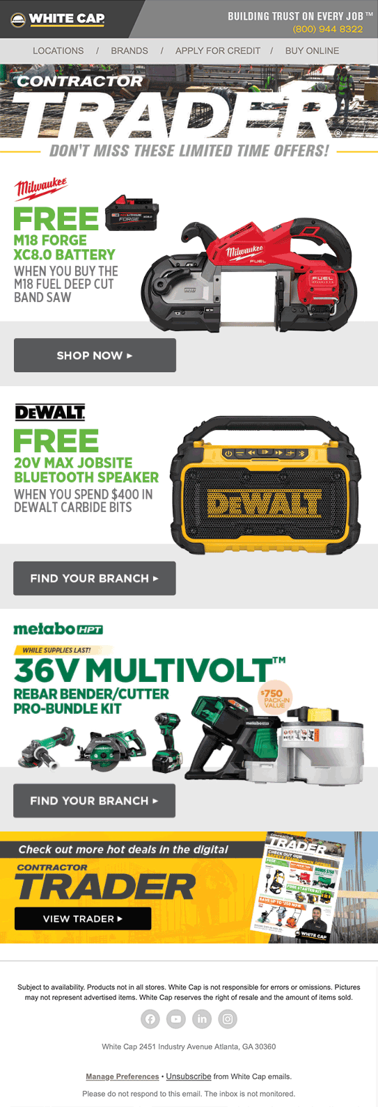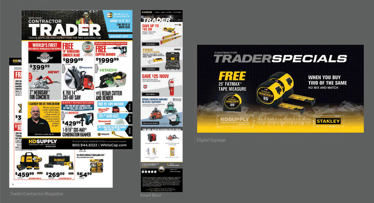 The Trader program spans multiple channels, including the Contractor Trader magazine, email, homepage banners, and in‑store digital signage.